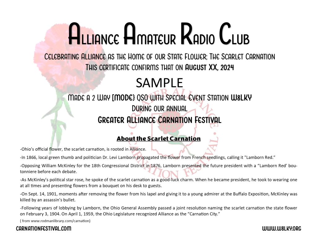 send us your QSL card & $3 for printing & Postage. We’ll respond with a beautiful 8 1/2″ X 11″ certificate suitable for framing.